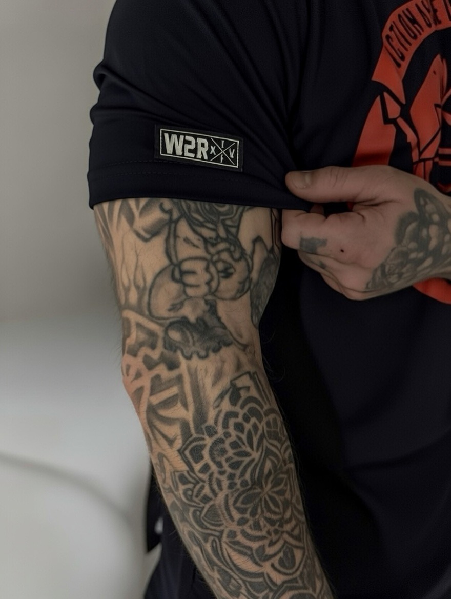 The tag on the sleeve and label inside the collar.